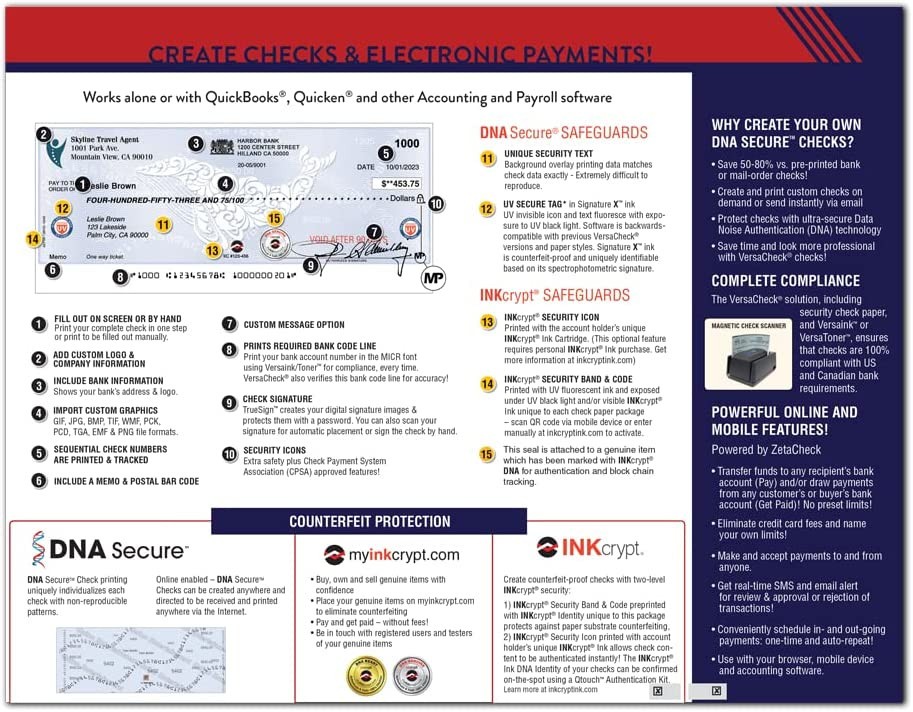 Includes VersaCheck Software Download, License for 100 Users, and 165 Print Validation codes. Additional print codes included FREE in VersaCheck Check Paper packaging.